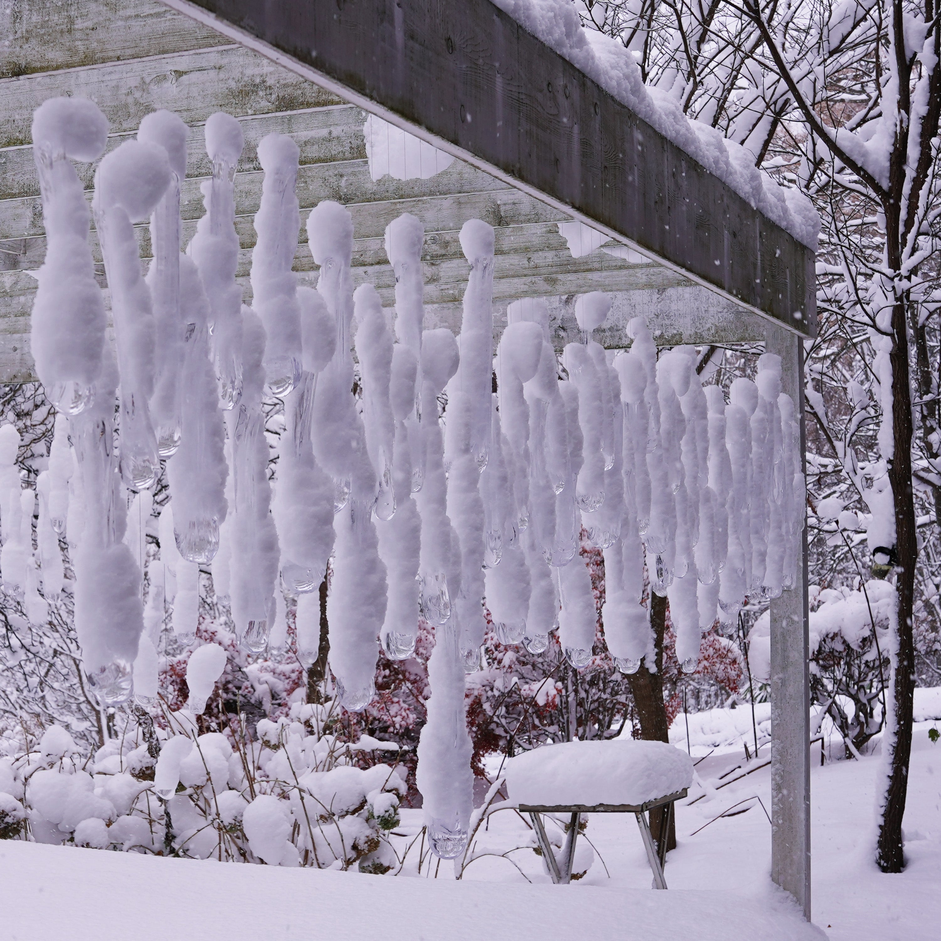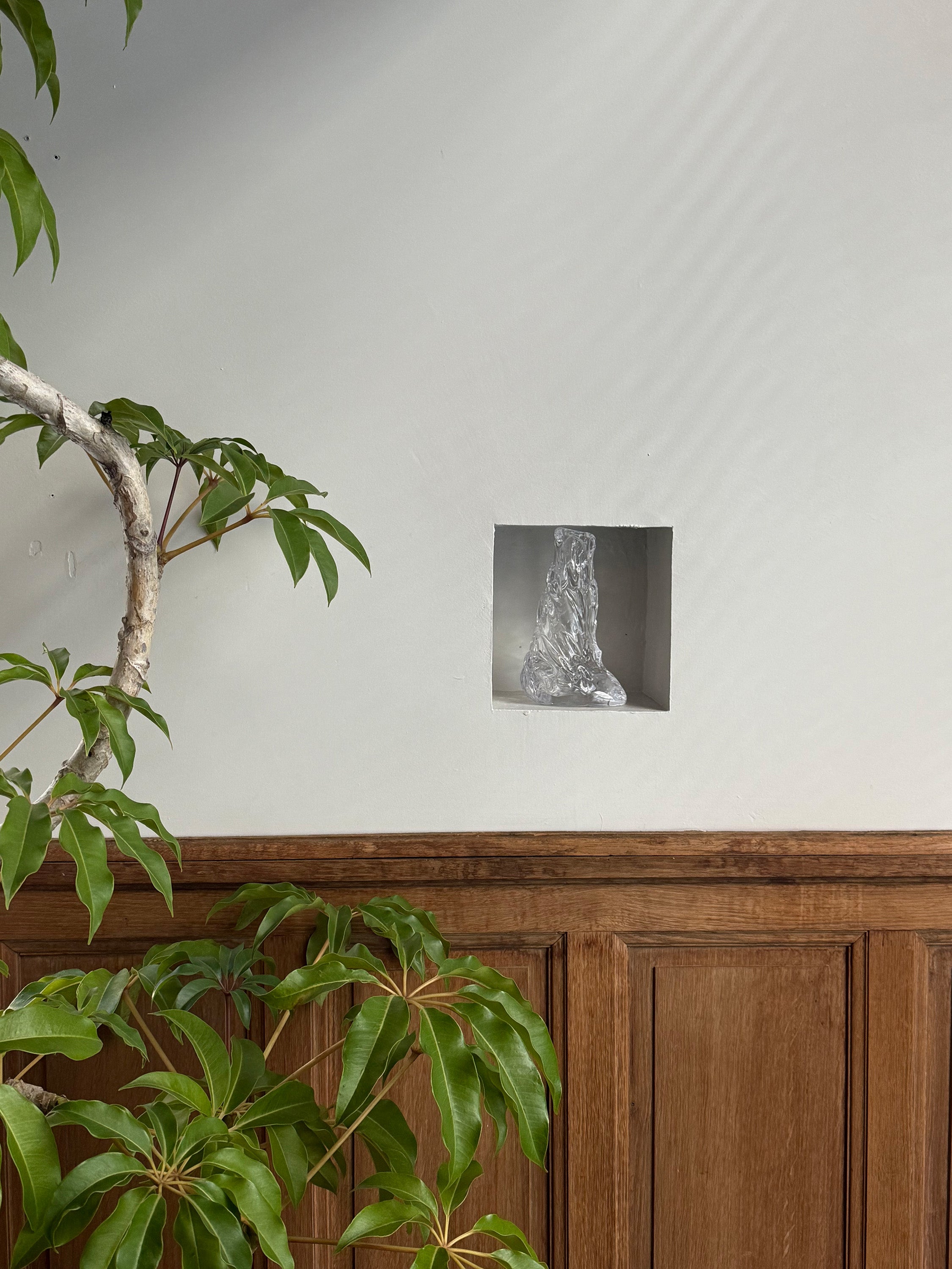無垢でどこか神秘的なその佇まいは、キンと凍てつく空気のなかで生まれる氷柱や氷爆、氷紋といった雪国の自然情景と重なるようにも思えます。しかし実は、高臣さんの創作源は「人」。「人が好き」だという高臣さんは、人との出会いや思い出、会話の断片をつなぎ合わせてひとつの物語を紡ぎだし、言葉としてタイトルを定め、かたちを立ち上げていくのだといいます。無色透明なガラスは、目には見えない色とりどりのストーリーを静かに内包しているのです。