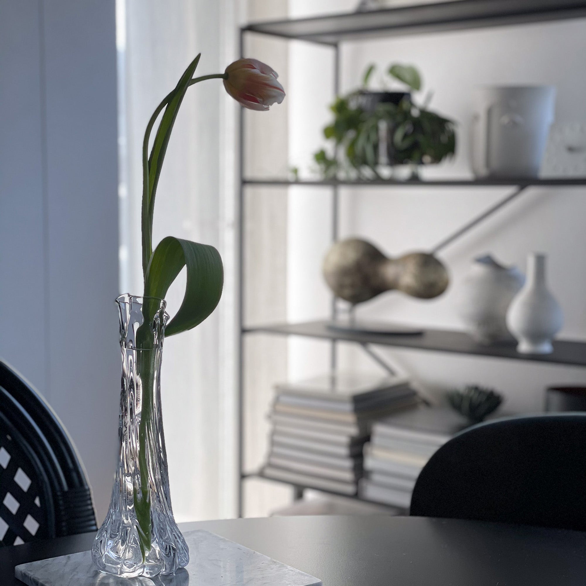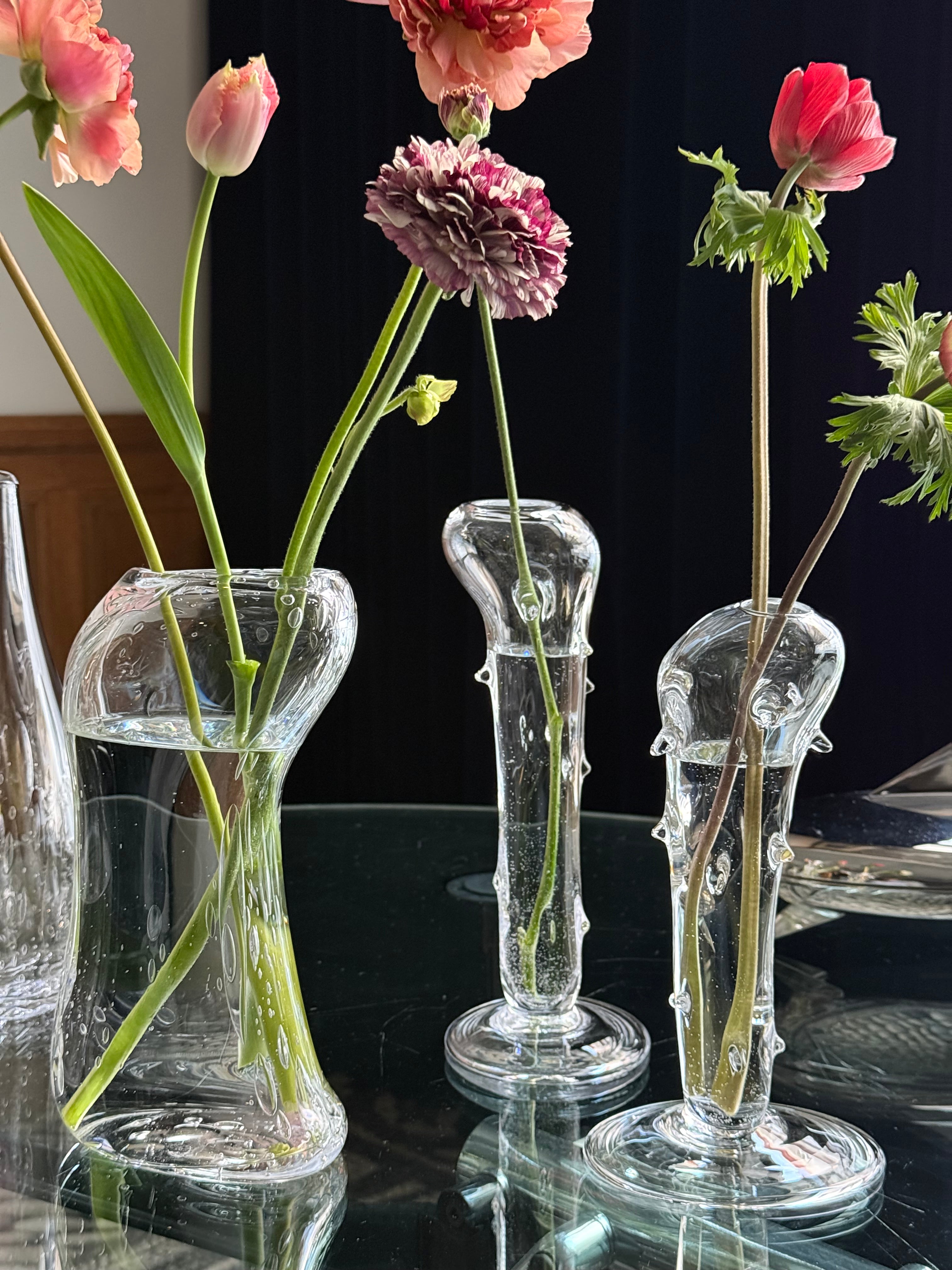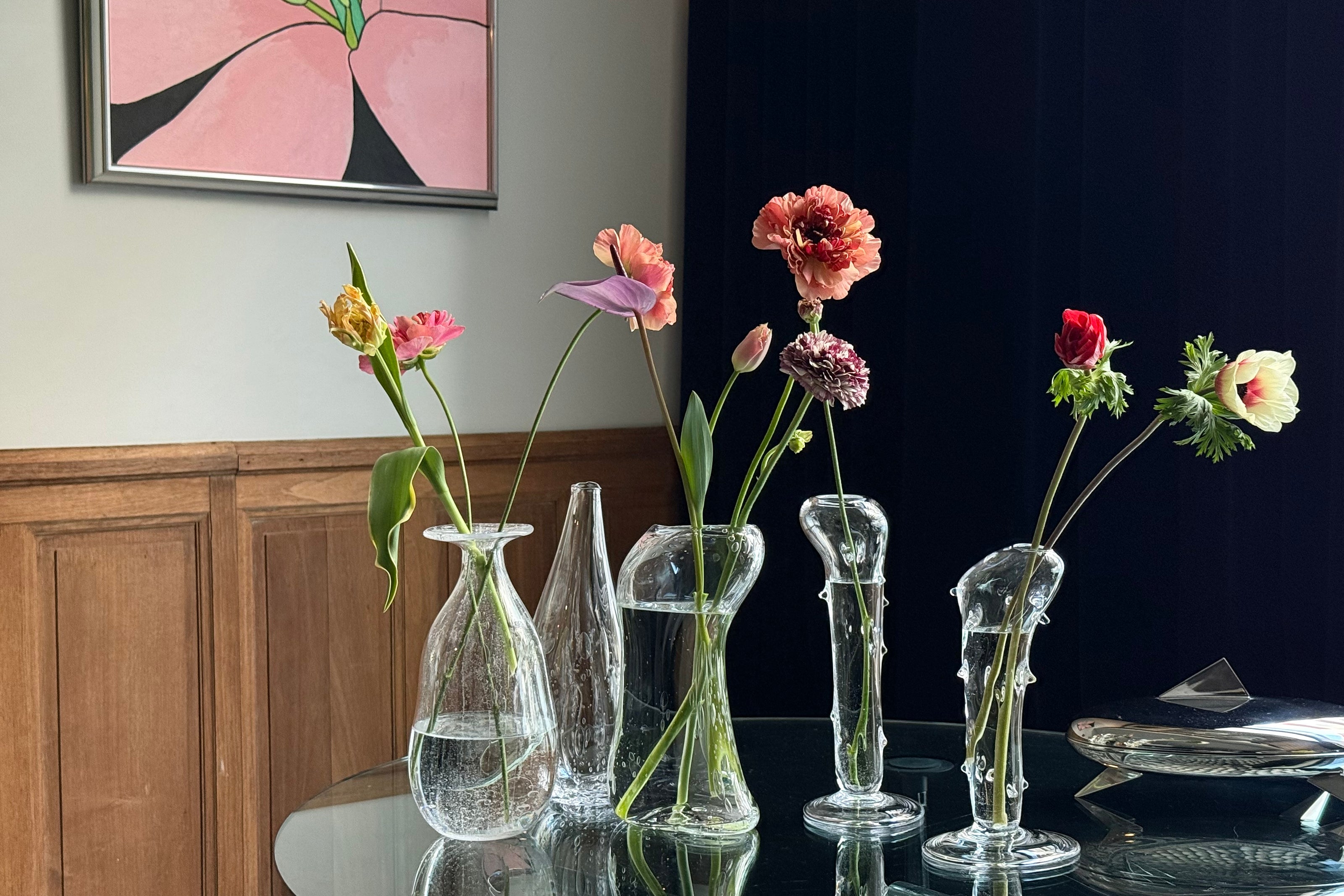 私がはじめて手にとった高臣さんの作品は、一輪挿しでした。澄みきった透明度、不均一でうねりを帯びた造形。重厚でありながら軽やかで、強い存在感を放ちながらも静謐な佇まいを備えている。その姿は、まるでアートピースのようでした。高臣さんの作品には、特定の国や地域、文脈に属さないアノニマスな存在感もあり、どんなスタイルのインテリアにも自然と調和すると直感しました。本展では、数ある作品のなかでも、3rdpartyのインテリアと親和性のある一輪挿しを中心とした花器をご紹介いたします。