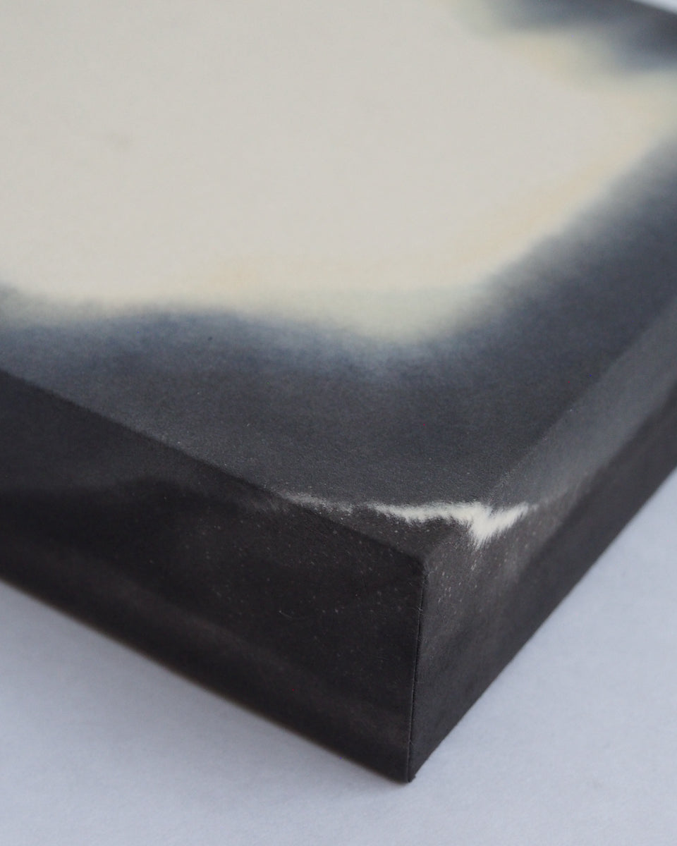 平面作品でありながら独特の厚みをもったこの作品は自立するので、デスクやキャビネットの上などちょっとした場所にも気軽に飾ることができます。また、水野さんならではのやわらかな筆致、テクスチュアが描き出すグラデーションをもっと間近で感じていただけるのもこの作品の魅力です。