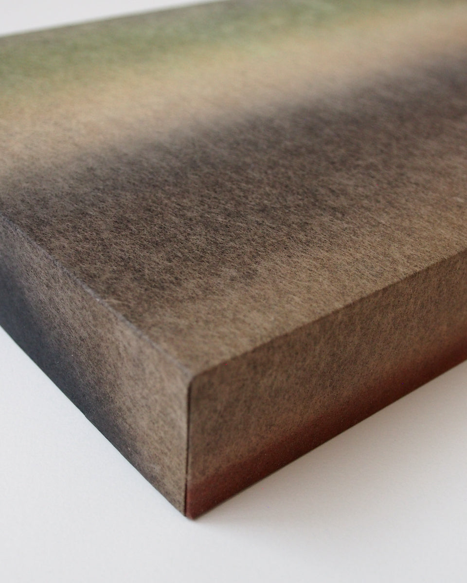 平面作品でありながら独特の厚みをもったこの作品は自立するので、デスクやキャビネットの上などちょっとした場所にも気軽に飾ることができます。また、水野さんならではのやわらかな筆致、テクスチュアが描き出すグラデーションをもっと間近で感じていただけるのもこの作品の魅力です。