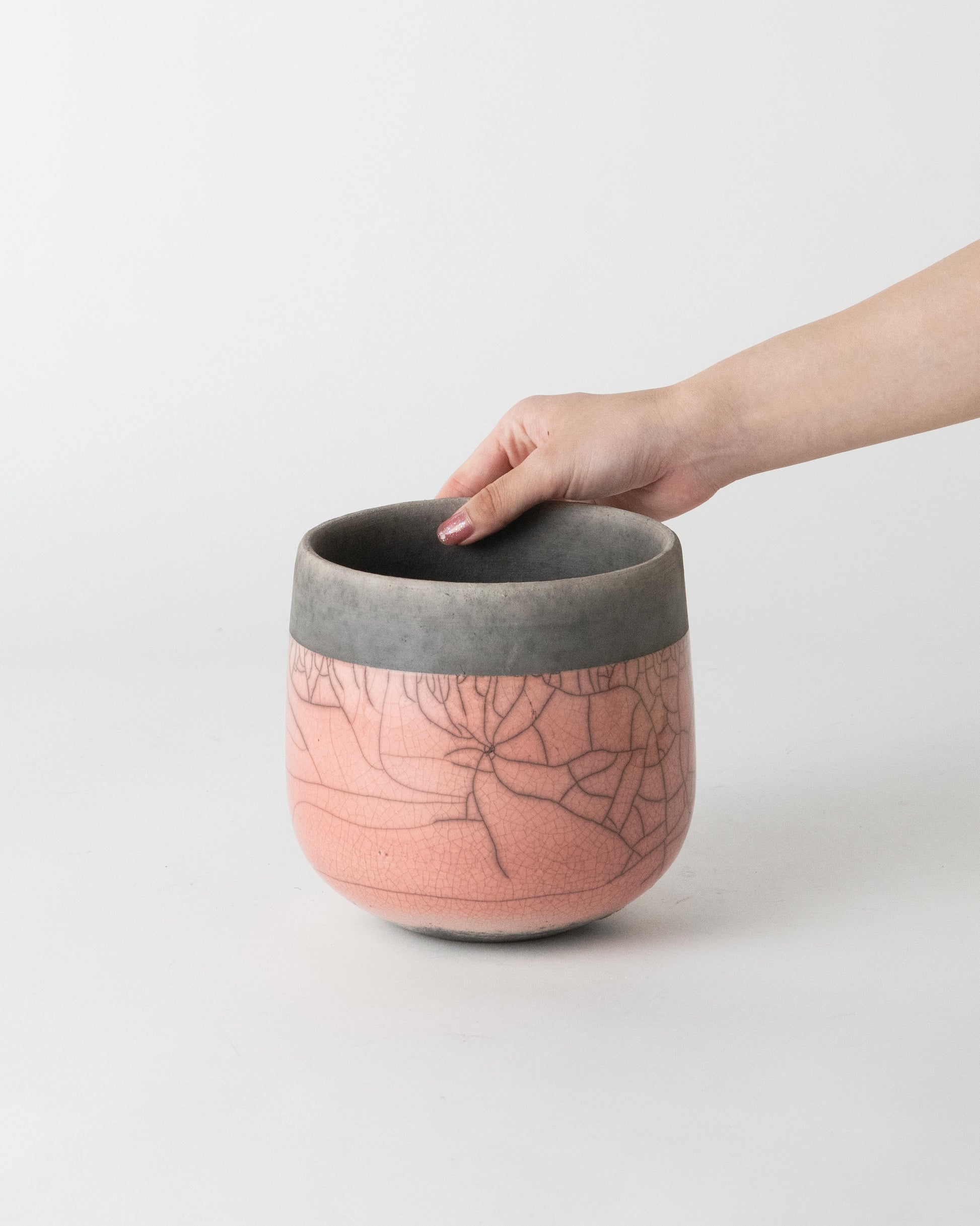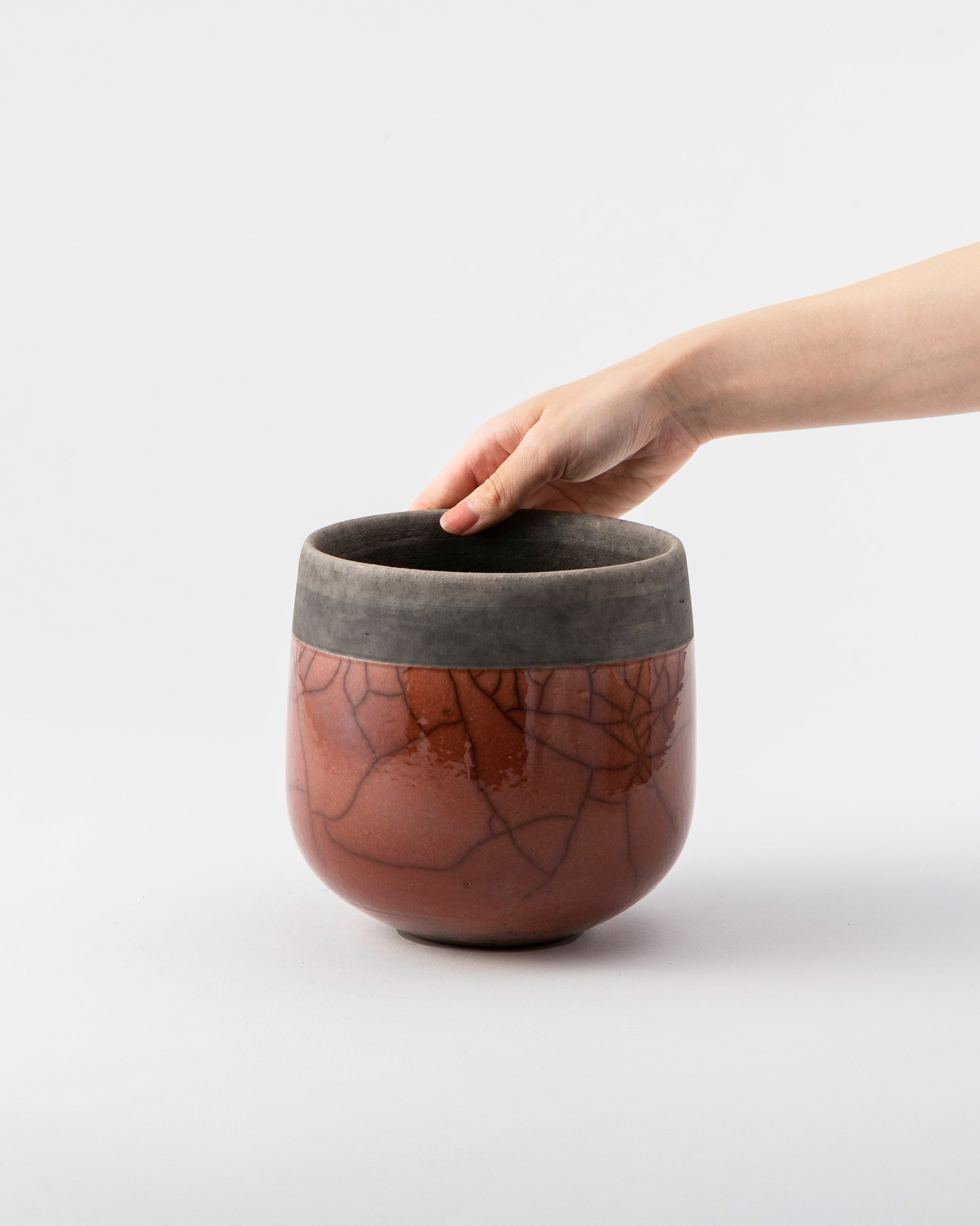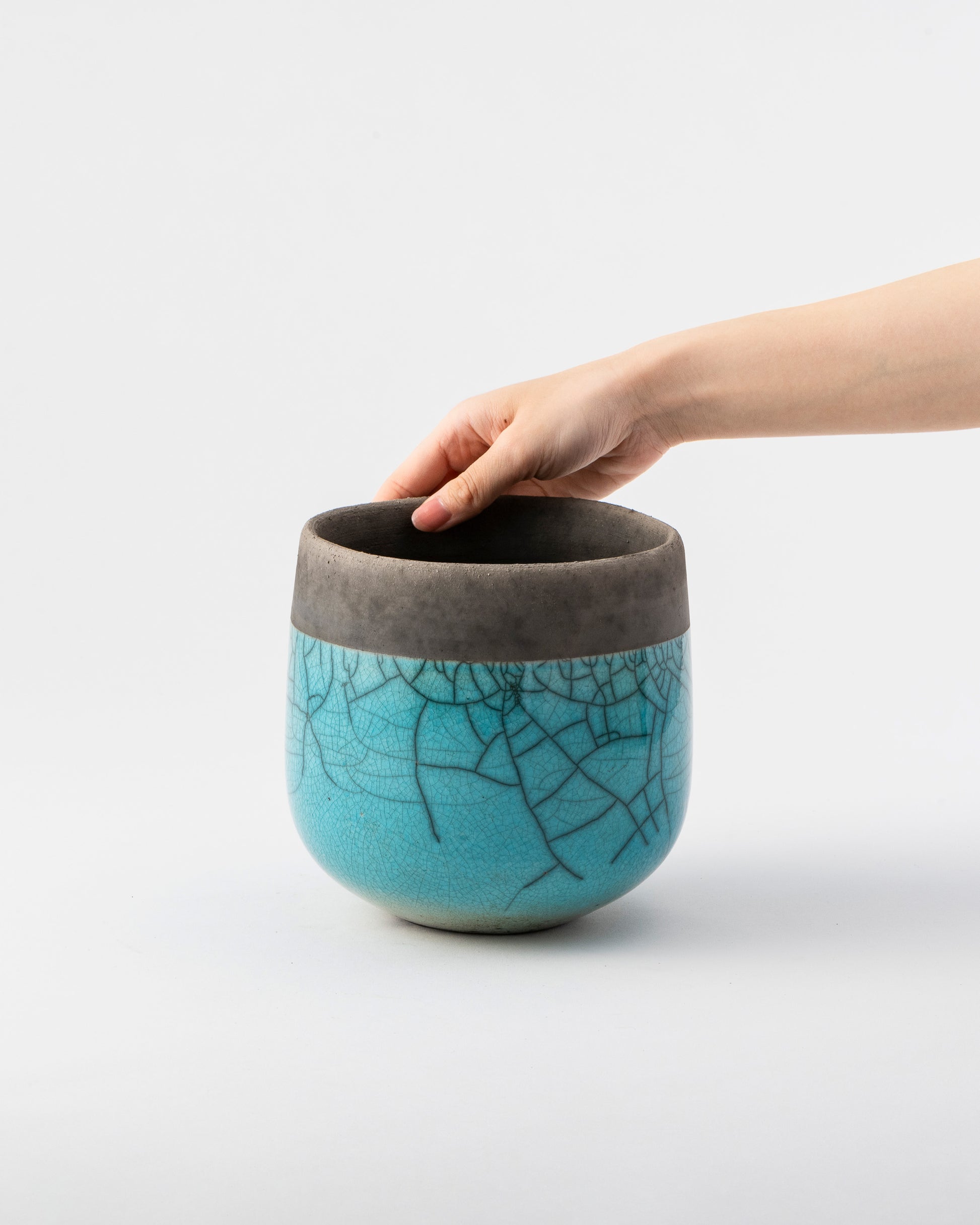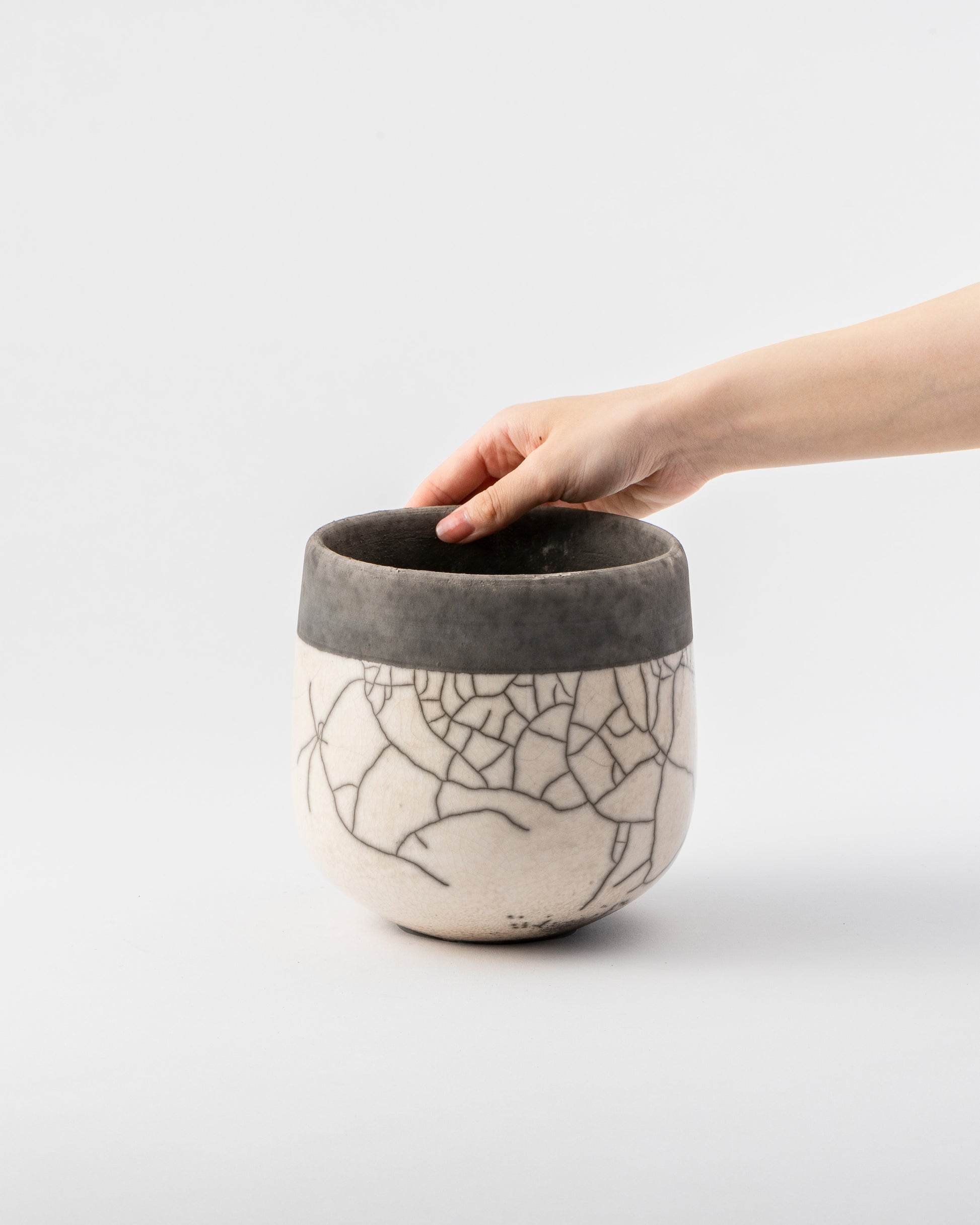 釉薬を施釉した後、オーブンで高温に熱したポットをおがくず の中に入れ急激に冷却し、その温度差によって貫入(ヒビ)を生み出します。自然が作り出す美しい模様は、出来上がるたびに私たちに新たな喜びを与えてくれます。