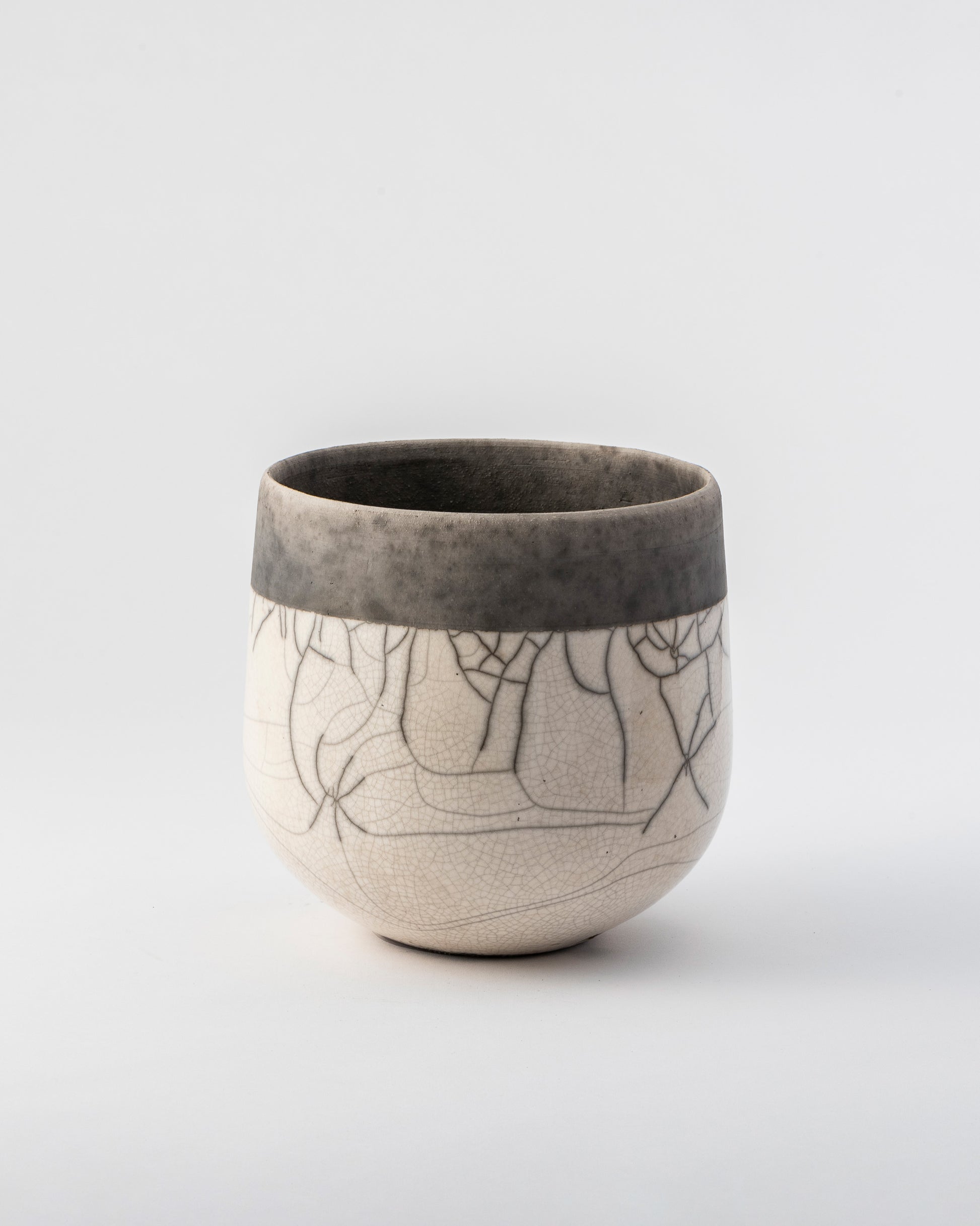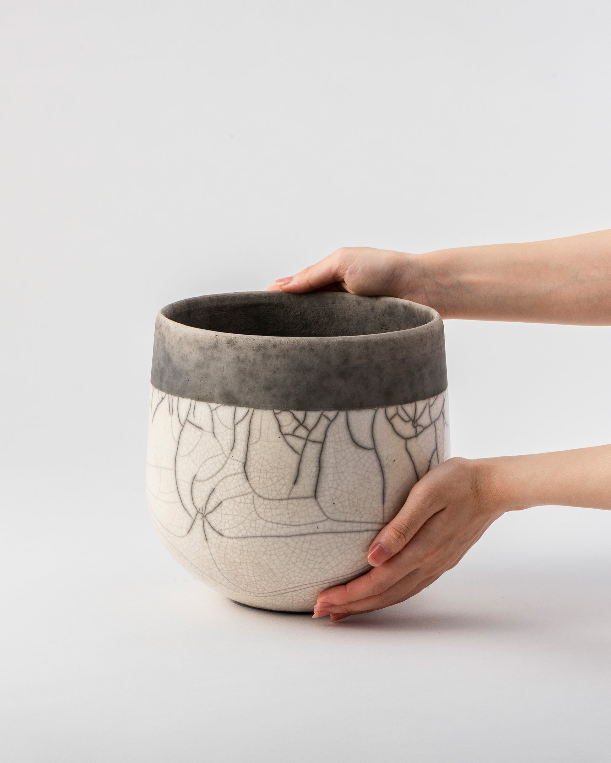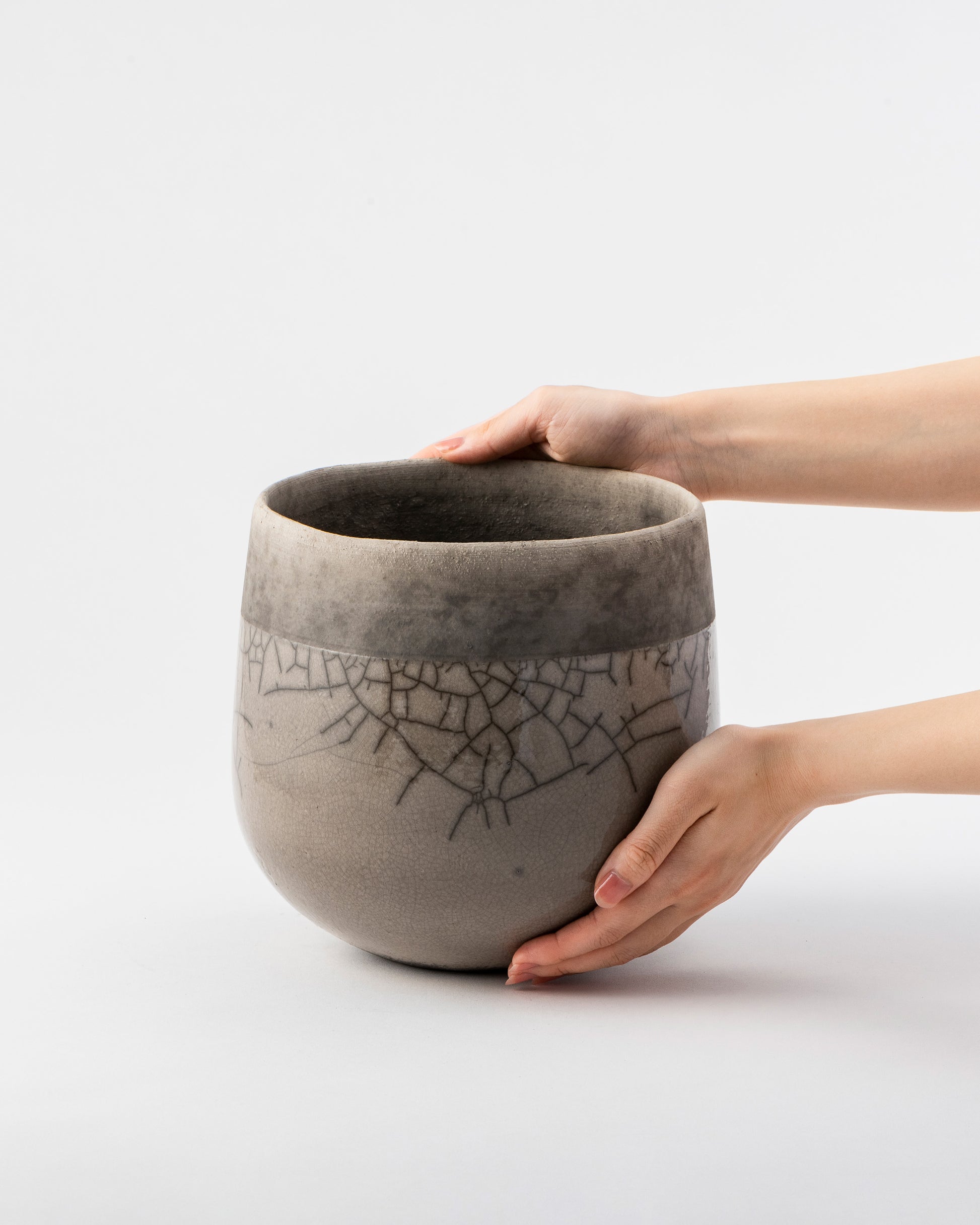 釉薬を施釉した後、オーブンで高温に熱したポットをおがくず の中に入れ急激に冷却し、その温度差によって貫入(ヒビ)を生み出します。自然が作り出す美しい模様は、出来上がるたびに私たちに新たな喜びを与えてくれます。